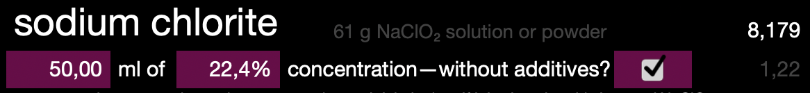 The recipe checker still I prefer. As you can see, gambling with somewhat different proportions of NaClO₂ and HCl allows us to have a fully activated CDH recipe. The only thing I wonder is about the byproducts of fully activated CDH, this is NaCl and whatever is mixed with the 80% NaClO₂ powder to make commercial 25/28% MMS.