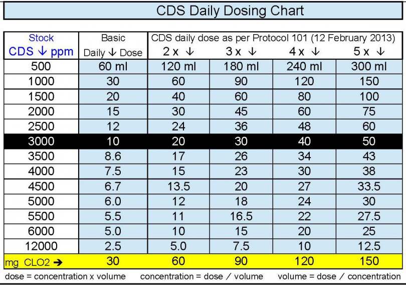 10 ml (0.33 oz) of CDS (3000ppm) in 1 liter (34 oz) of water per day.