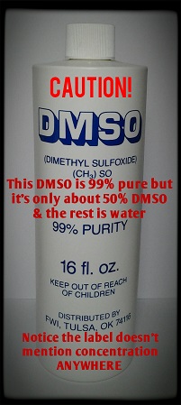 And here's my bottle of 99% pure DMSO. It may be 99% pure but after putting it into the fridge at about 40F, it DID NOT FREEZE SOLID as JB13's did but instead half froze so that it was kind of slushy. Based on that, I think it's about 50% DMSO and the rest is water: