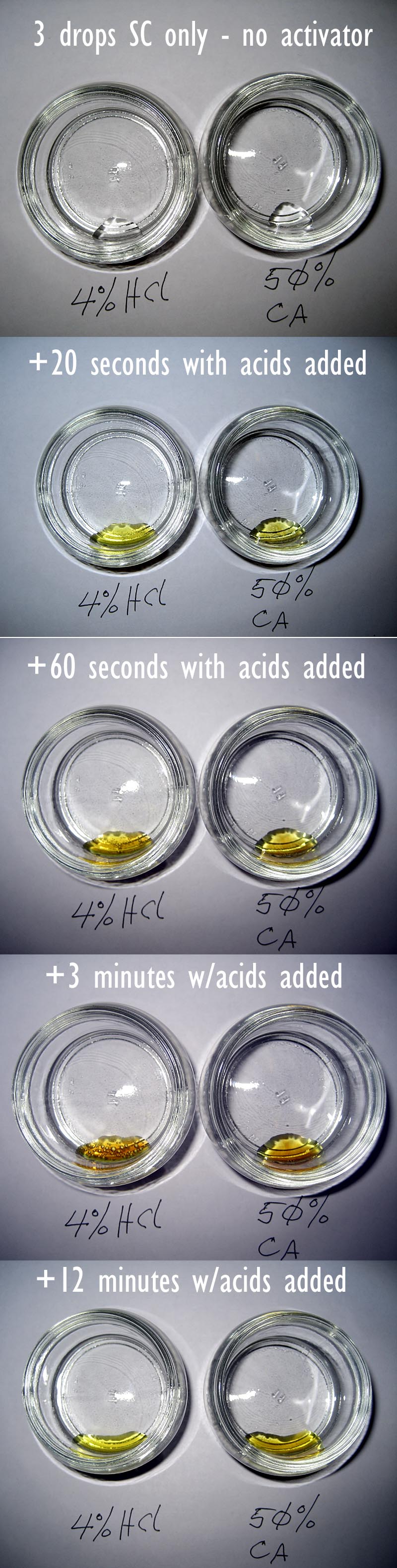 Was hoping TL would do it so we could determine if the HCL activation was as powerful as the CA. My own preliminary "lab" tests indicate my HCl is a bit weak needing 4 drops to parallel