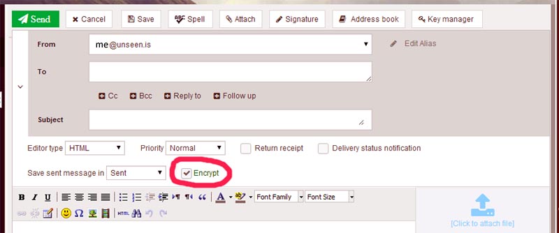 The email itself is sent through an encrypted tunnel and you can also encrypt the contents. To encrypt the contents of an email to another Unseen user, put a check mark in the box "Encrypt".