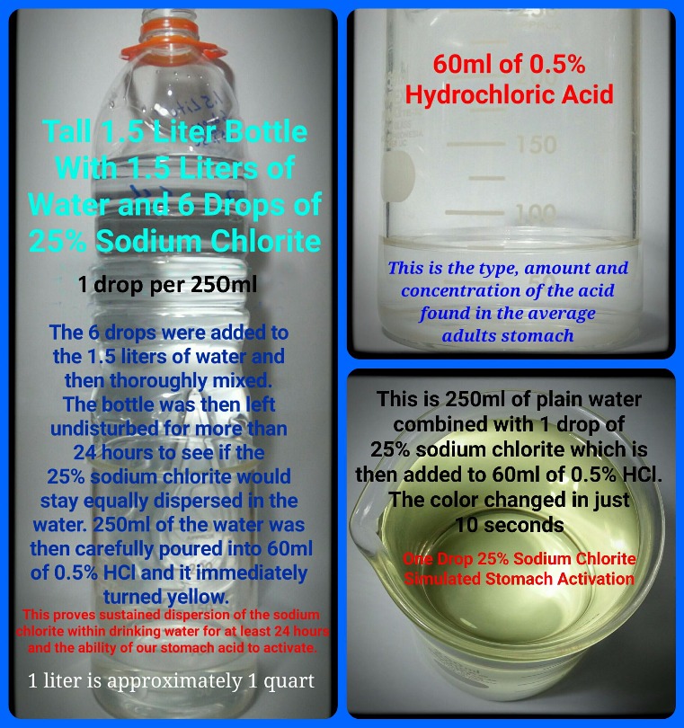 By doing various tests on a test bench with stomach acid and other digestive solutions you first get chlorous acid that lasts only a seconds before it turns into chlorine dioxide. And making 20 tons of chlorine dioxide and one tenth of an ounce is quite different and gives you different results. So when you add 1 drop of Sodium chlorite (22.4%) to one drop of HCl (4%) acid you will get an instant 24000 ppm chlorine dioxide which is a little more than 1.1% chlorine dioxide. But you have only turned 1/10th of the sodium chlorite to chlorine dioxide. If you add 9 more drops of acid you will turn all of the sodium chlorite into acid. Sitting in a glass of water that chlorine dioxide will last almost 24 hours, but put some saliva and some digestive enzymes into the glass and the chlorine dioxide will last only about an hour.