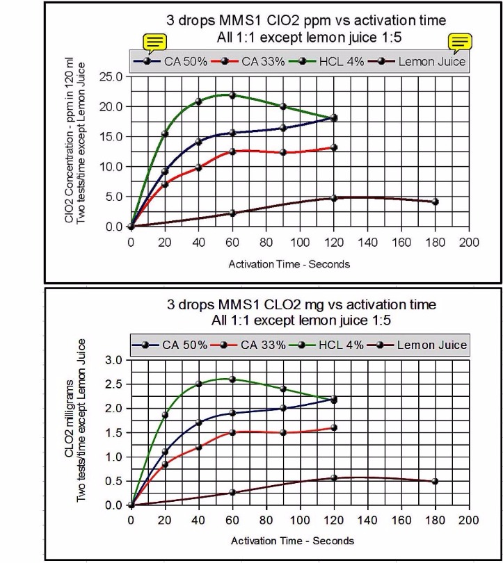MMS1 activation time is 30 seconds, says Jim Humble, and Kerri says 60 seconds. Here is a chart showing testing I did some years ago and you can see that using 4% HCL, CLO2 (generated externally) will peak at about 60 seconds. The remaining 90% CLO2 from residual MMS should be released by stomach acid.