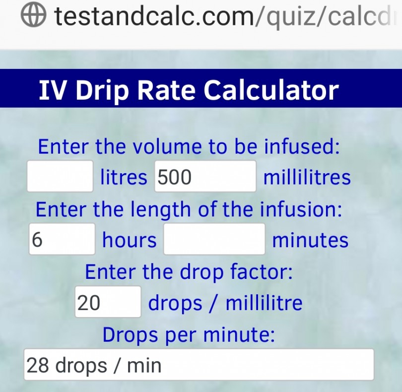 I would then set the drip at 28 drops per minute, which assuming 20 drops per milliliter, would take 6 hours to finish the 500ml.