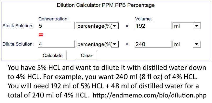 I know this question has been raised before but I cannot seem to find the link I can purchase 5% HCL at a reasonable cost and would like to know if this would substitute for the 4% recommended Also if I were to dilute it what would be the amount of water I would need to add to 100ml acid at 5%