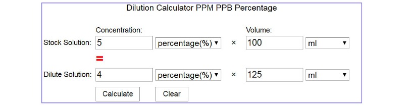 Instead of 30% stock solution you will be using 5% stock solution. Fill in the amount (volume) of your stock solution (in ml) as well and calculate.