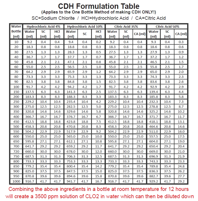 Upon first glance at the file, which opens up into the excel tab which calculates for Citric Acid at 35% concentration, it will appear that the calculations are off but that is only because the breakdown that I provide shows how someone can make any desired quantity of (the Citric Acid form of) CDH at all once, by the, direct, addition of WATER, SODIUM CHLORITE, and CITRIC ACID (which needs to sit and react for at least 8 hours before being put into the fridge).