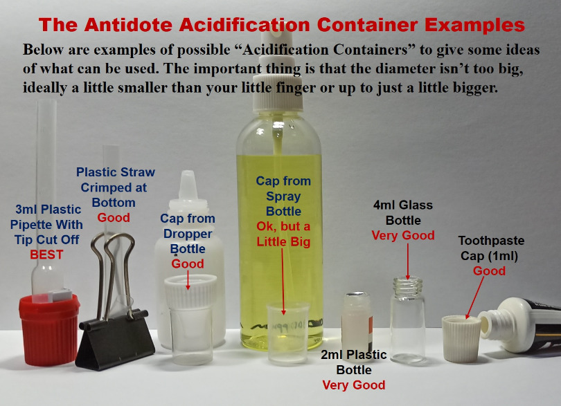 “The Antidote” is ten drops (0.5ml) of 20 to 25% Sodium Chlorite that has been acidified with ten drops (0.5ml) of 4% Hydrochloric Acid for exactly 5 minutes in a container that is narrow enough or sealed in such a way, so as to not allow hardly any of the Chlorine Dioxide gas to escape during the process (see photo of "Acidification Containers" below). After 5 minutes, the 1ml solution will have a concentration of 30,000 ppm Chlorine Dioxide and should be immediately added to either: