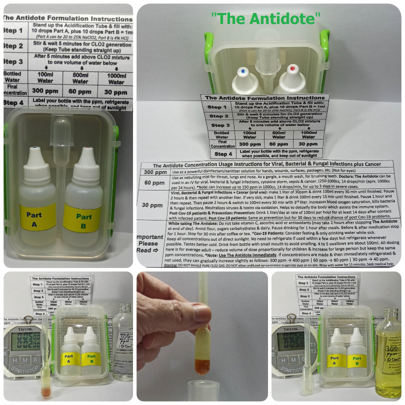 By immediately adding “The Antidote” to water after 5 minutes, the acidification process will be slowed considerably, leaving a small amount of Hydrochloric Acid unused, which plays a role in “The Antidote’s” effectiveness, especially if used intravenously. Besides Chlorine Dioxide and a very small amount of Hydrochloric Acid, “The Antidote” will also contain approximately 66% of the initial Sodium Chlorite used, and a small amount of Chlorate. All these components of “The Antidote” have antiviral, antibacterial, antifungal and anti-cancer properties and that’s why it has been named, “The Antidote”.
