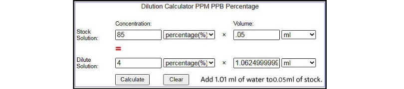I am not sure if I am on the right track. For example: If I have an 85% solution in 1 drop, or 0.05ml and I want to dilute it to 4%To calculate the dilution(C1)(V1) = (C2)(V2), or 85% x 0.05ml = 4% x 1.06 mlSo, to create a 4% solution I have to add 1.06ml to the 0.05mlIs this correct?
