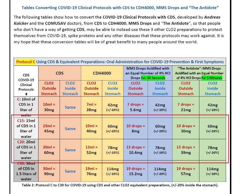 Protocol 1 for C19 prevention - Drink 2 liters of water a day with 3 to 5 drops of unactivated MMS in each liter (6 to 10 drops a day)