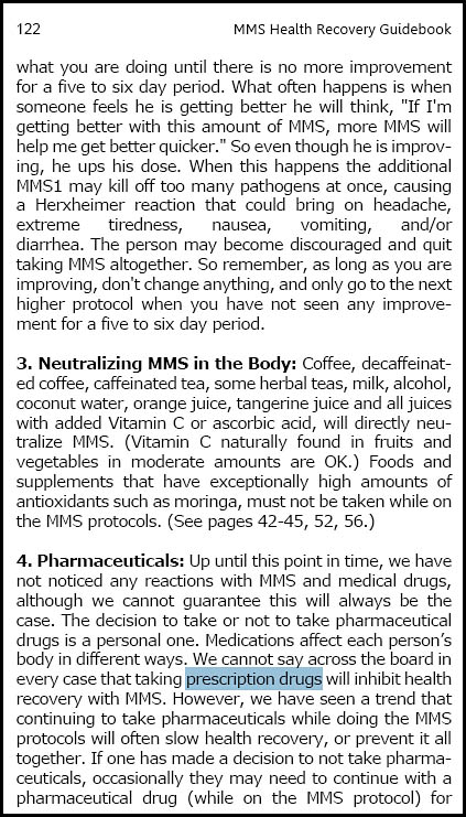 Might be best if you could wait one hour or longer after the last MMS dose of the day to take pharma drugs, and eat and drink anything you want in any quantity instead of just snacks.