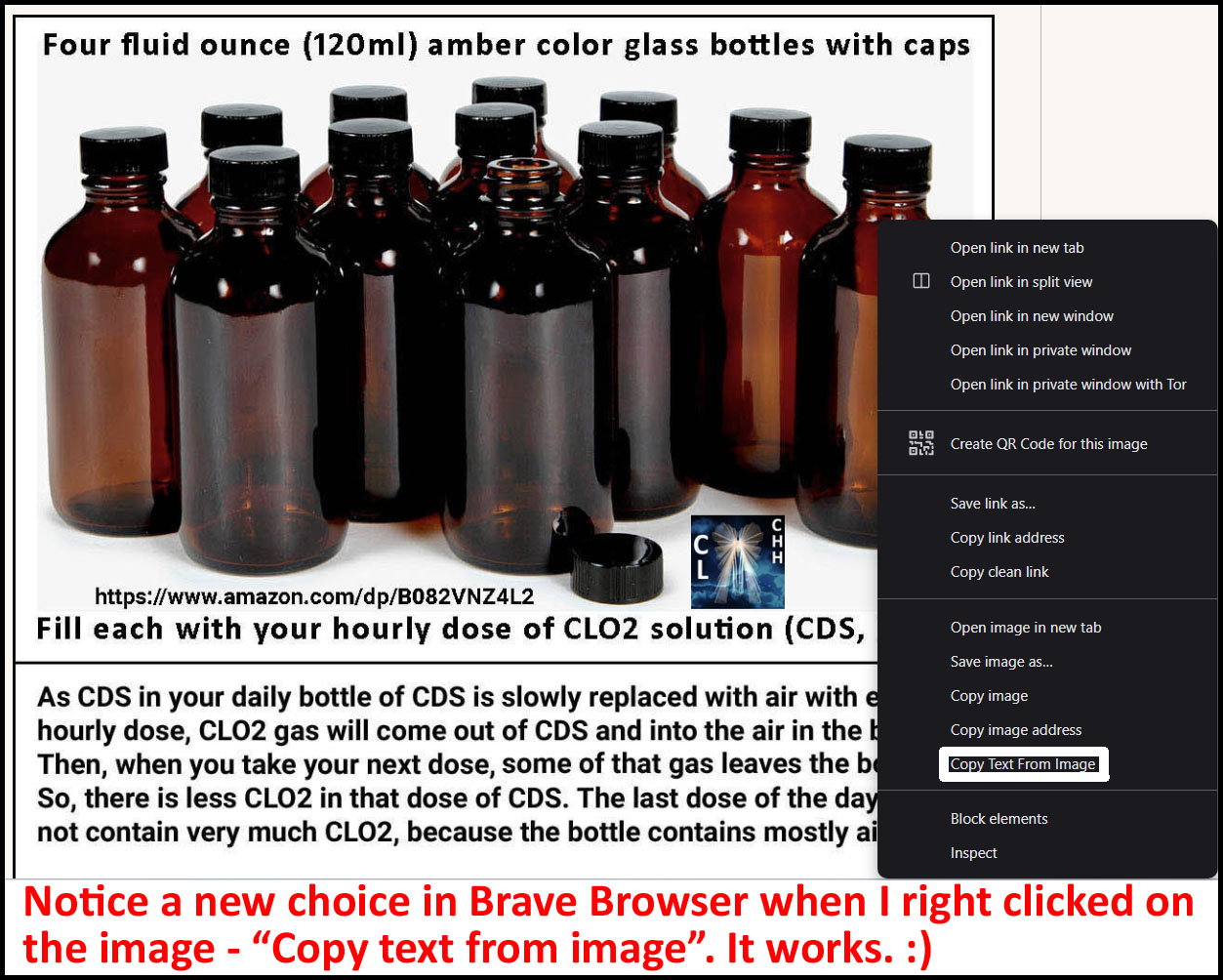 I hope you can translate the text in the image. Basically the idea is to make up hourly doses, including the dilution water, into each 120ml amber glass bottle, whether it be MMS1, CDS or CDH. All you have to do to ingest an hourly dose is to remove the bottle cap and drink the dose. Takes about 10 seconds. The bottle cap is removed only one time.