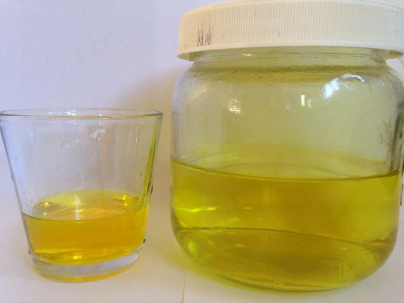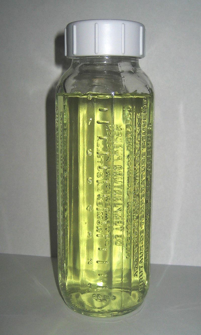 Here is my dosing bottle, an 8 fluid ounce (US) glass baby bottle with a tight sealing cap.
