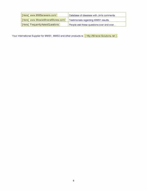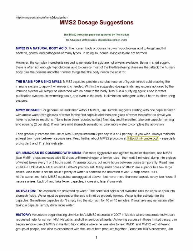 The one capsule dose is just for the first day, then he recommends going up to 4/day. I think the most important part of this document is that chart comparing methods of using mms1 & 2, because I don't think it is available anywhere else, except maybe an old newsletter. It's not on that mms2 intro page on Jim's biz site. This document also has the report on the 75 AIDS cases where half were treated with mms1 and half with mms2 and the results were equivalent, which I don't think appears in that intro page either.