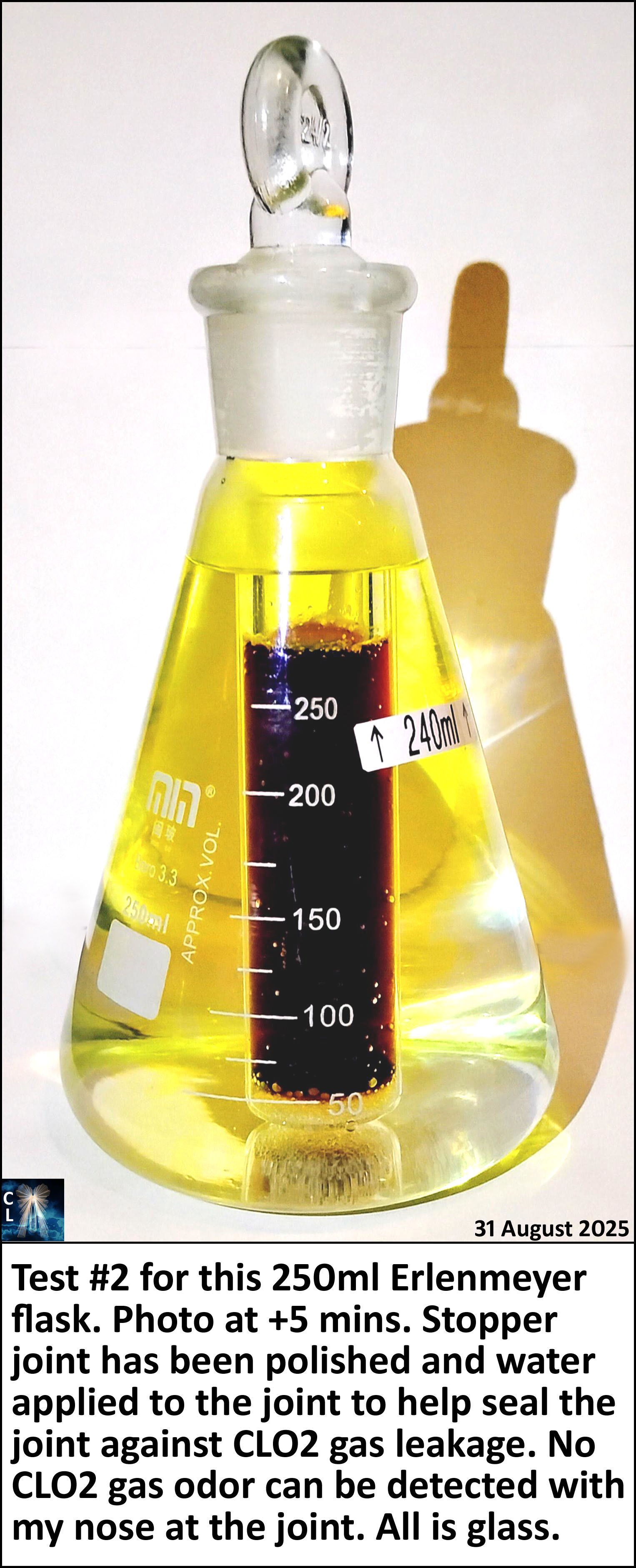 Polishing the bottle neck-to-stopper joint and applying water to the joint as it was being closed, has stopped all CLO2 gas leakage from the flask. Nothing smelled.