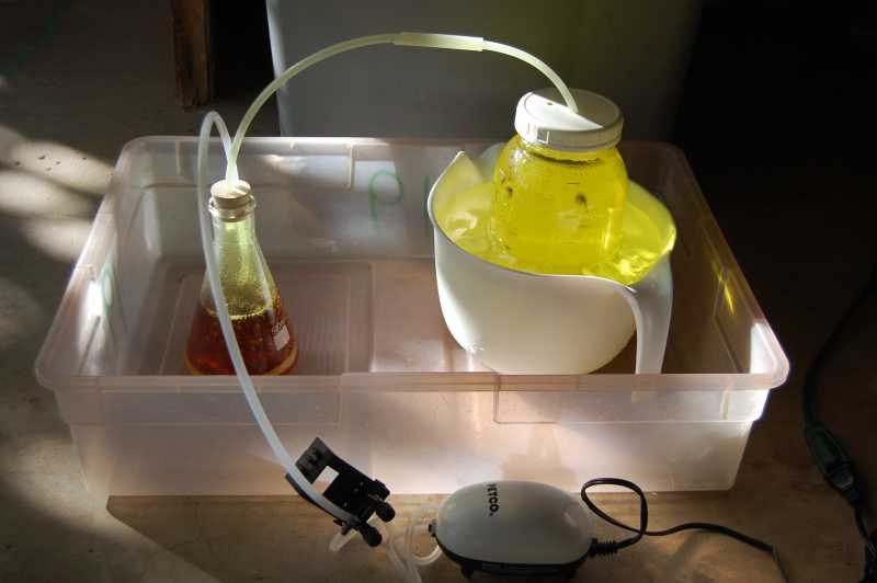 I had 1000 ml of cold distilled water in the 1/2 gal. mason jar and used 110 ml of MMS and 110 ml of HCl 4%. I let the air pump for 30-40 mins. till the chambers were both the exact same yellow color.