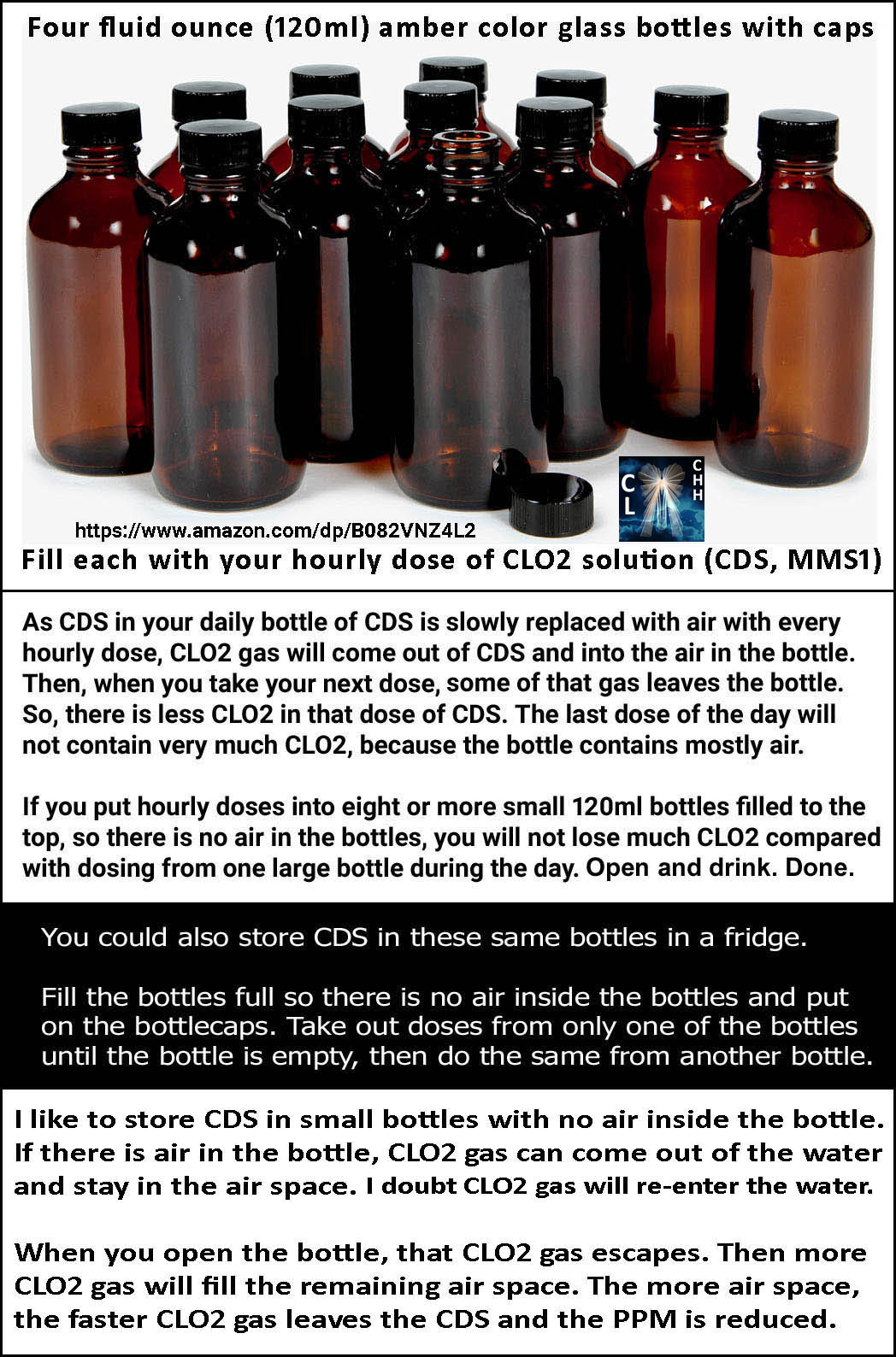 Another method is to fill 8 or 10 small bottles of about 120ml with MMS1 and drink one bottle each hour. Takes about 10 seconds to drink a dose. What could be simpler? Be sure to fill each bottle full to the top to reduce air space. No need to keep in a fridge.