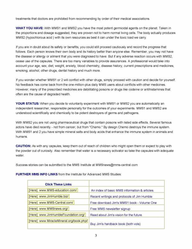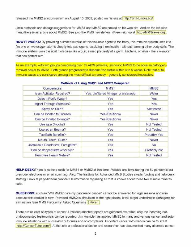 The one capsule dose is just for the first day, then he recommends going up to 4/day. I think the most important part of this document is that chart comparing methods of using mms1 & 2, because I don't think it is available anywhere else, except maybe an old newsletter. It's not on that mms2 intro page on Jim's biz site. This document also has the report on the 75 AIDS cases where half were treated with mms1 and half with mms2 and the results were equivalent, which I don't think appears in that intro page either.
